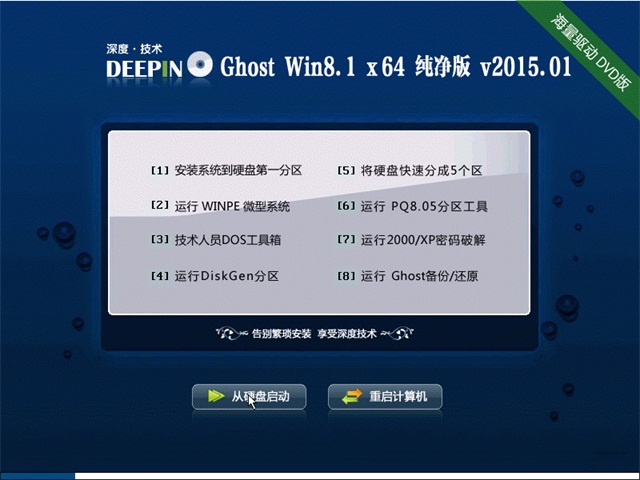 随着触屏电脑的普及,Windows8.1系统随之成为了用户们的主流操作系统,Win8.1独特的Modern界面,可以让你使用平板一样操作电脑,深度技术 Ghost Win8.1 x64 纯净版 v2015.01版本以最新Win8.1 64位源版安装盘通过精简部分自带应用,加入稳定的优化方案,集成最新驱动程序及常用软件,让普通用户也能方便快捷的安装Win8.1系统,本版整合最新DX游戏组件,Flash player最新版,.Net 3.5 4.5等常用运行库,更新安全更新到最新,通过微软正版验证,支持在线更新,是一款值得使用的Win8.1操作系统。