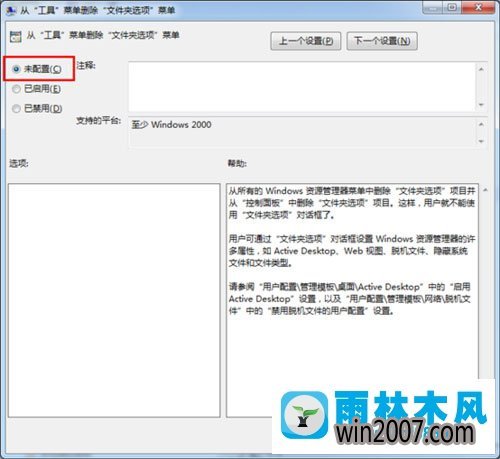 3、找到“从工具菜单删除文件夹选项”项目,如下图,目前显示是启用的状态;