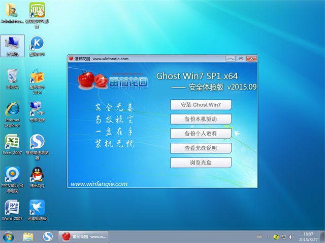 番茄花园GHOST WIN7 SP1 X64 安全体验版 V2015.09(64位)